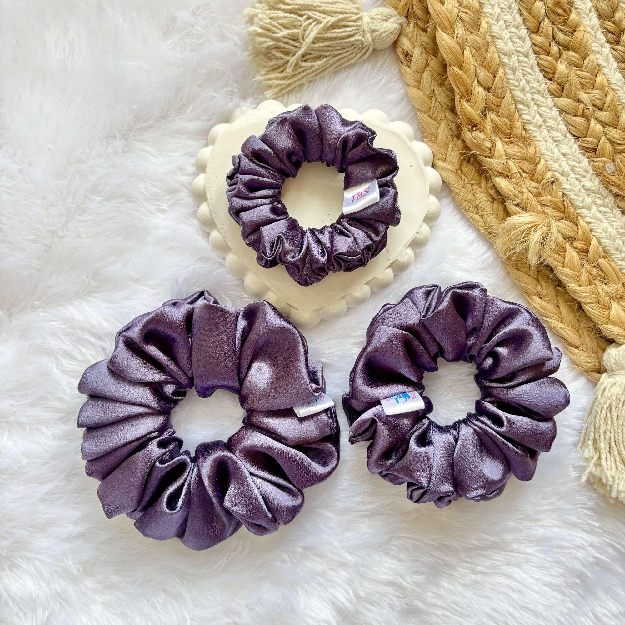 •Plain satin scrunchies in Small, Medium & Large sizes